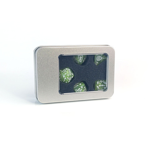 सिल्वर विंडो टिन बॉक्स पोलीहेड्रोन डाइस ने स्पंज के साथ टेबल गेम उपहार बॉक्स के लिए टिन बॉक्स